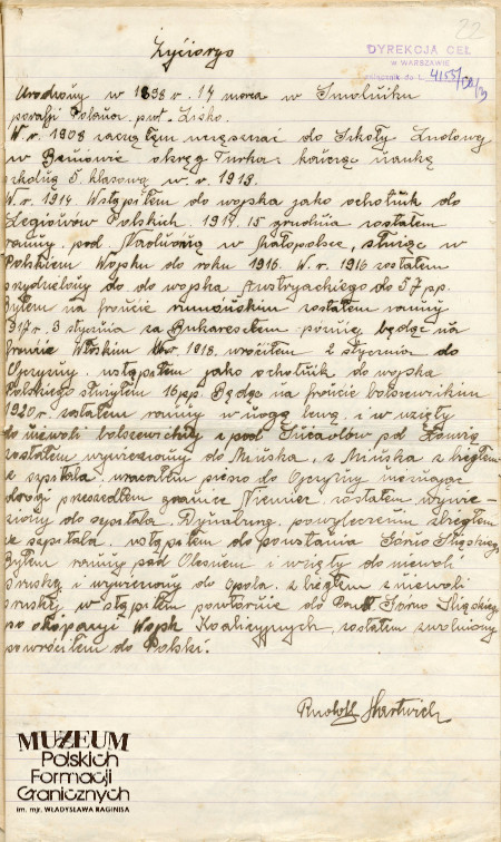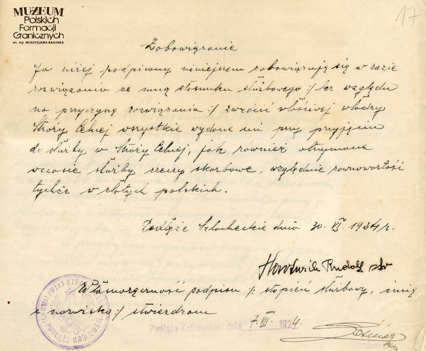 Pokaż opis pliku 1.Tytuł: Rudolf Hartwich 2. Treść: zobowiązanie Rudolfa Hartwicha do zwrócenia otrzymanego wyposażenia na wypadek zwolnienia ze służby w Straży Celnej 3. Hasła przedmiotowe: Straż Celna, kadra 4.Wytwórca: Rudolf Hartwich 5.Czas powstania: 30.06.1924 r. 6.Miejsce sporządzenia: Polska, Podłęże Szlacheckie 7.Materiał i technika wykonania: papier, pismo odręczne 8.Wymiary: 21 x 17 cm 9.Stan zachowania: dobry 10.Miejsce przechowywania/właściciel: Archiwum Straży Granicznej w Szczecinie -