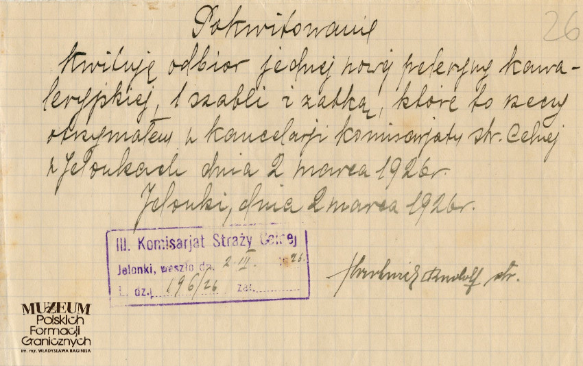 Pokaż opis pliku 1.Tytuł: Rudolf Hartwich 2. Treść: pokwitowanie odbioru peleryny kawaleryjskiej oraz szabli przez Rudolfa Hartwicha 3. Hasła przedmiotowe: Straż Celna, kadra 4.Wytwórca: Rudolf Hartwich 5.Czas powstania: 02.03.1926 r. 6.Miejsce sporządzenia: Polska, Jelonki 7.Materiał i technika wykonania: papier, pismo odręczne 8.Wymiary: 18 x 11.5 cm 9.Stan zachowania: dobry 10.Miejsce przechowywania/właściciel: Archiwum Straży Granicznej w Szczecinie -