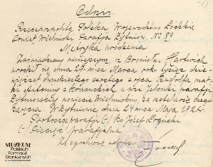 Pokaż opis pliku 1.Tytuł: Rudolf Hartwich 2. Treść: odpis aktu urodzenia Bronisława Hartwicha - syna strażnika granicznego Rudolfa Hartwicha 3. Hasła przedmiotowe: Straż Celna, kadra 4.Wytwórca: Parafia Żytniów 5.Czas powstania: 24.05.1926 r. 6.Miejsce sporządzenia: Polska, Żytniów 7.Materiał i technika wykonania: papier, pismo odręczne 8.Wymiary: 21 x 17.5 cm 9.Stan zachowania: dobry 10.Miejsce przechowywania/właściciel: Archiwum Straży Granicznej w Szczecinie