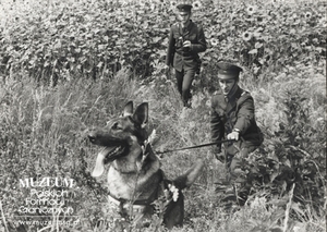 Pokaż opis pliku 1. Tytuł: patrol Wojsk Ochrony Pogranicza 2. Opis obrazu: starszy kapral WOP z psem służbowym 3. Data wydarzenia: lata 60. XX w. 4. Osoby widoczne: brak danych 5. Hasła przedmiotowe: Wojska Ochrony Pogranicza, ochrona fizyczna 6. Opis techniczny: oryginał, czarnobiałe 7. Autor: Józef Fill – Wojskowa Agencja Fotograficzna 8. Miejsce przechowywania/właściciel: Piotr Waseńczuk -