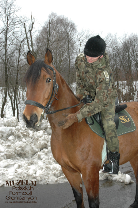 2. Opis obrazu: funkcjonariusz Bieszczadzkiego Oddziału Straży Granicznej podczas patrolu konnego w terenie