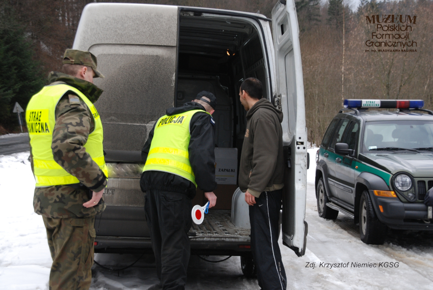 2. Opis obrazu: funkcjonariusz z Placówki Straży Granicznej w Wetlinie (Bieszczadzki Oddział Straży Granicznej) oraz funkcjonariusz Policji podczas kontroli dokumentów