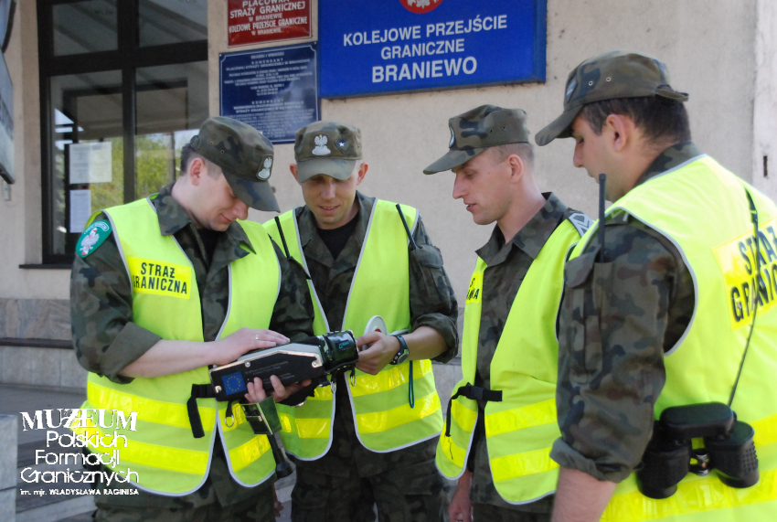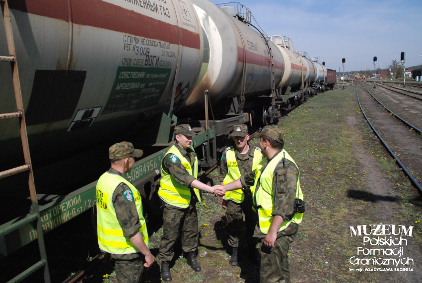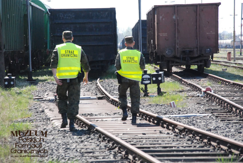 2. Opis obrazu: funkcjonariusze z Placówki Straży Granicznej w Braniewie (Warmińsko-Mazurski Oddział Straży Granicznej) przed przystąpieniem do kontroli pociągów towarowych na terenie Kolejowego Przejścia Granicznego w Braniewie