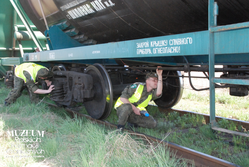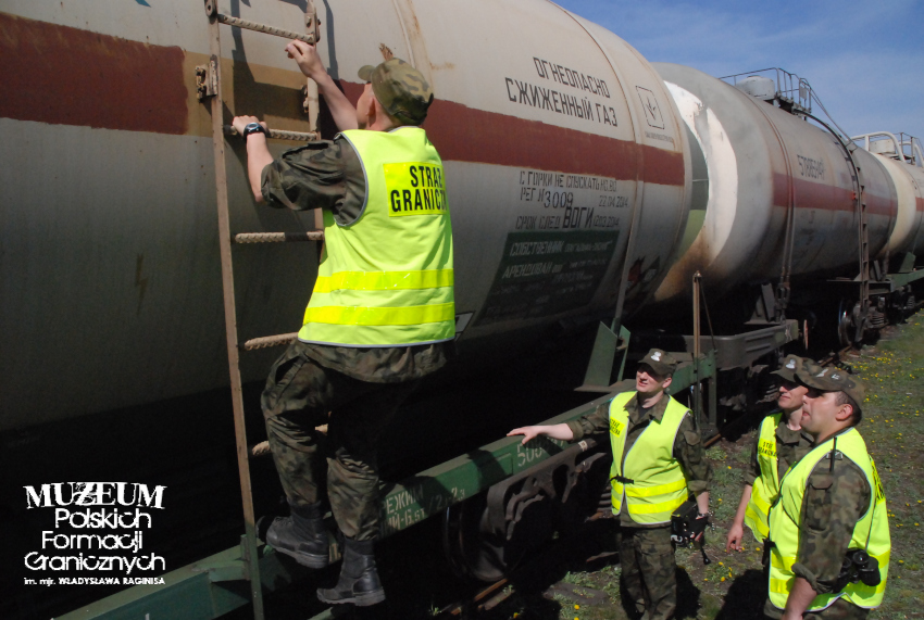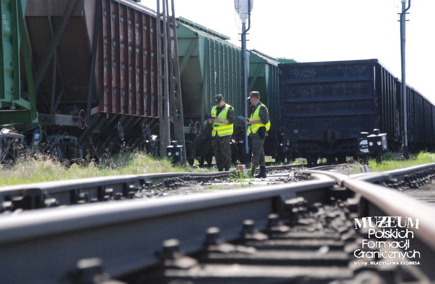 2. Opis obrazu: funkcjonariusze z Placówki Straży Granicznej w Braniewie (Warmińsko-Mazurski Oddział Straży Granicznej) podczas kontroli pociągów towarowych na terenie Kolejowego Przejścia Granicznego w Braniewie