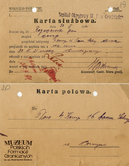 2. Treść: dokument z informacją dotyczącą przyjęcia szer. Jana Rogaczewskiego z 4 Kompanii, 16 Batalionu Celnego do Szpitala Okręgowego W.P. w Grudziądzu na oddział neurologiczny