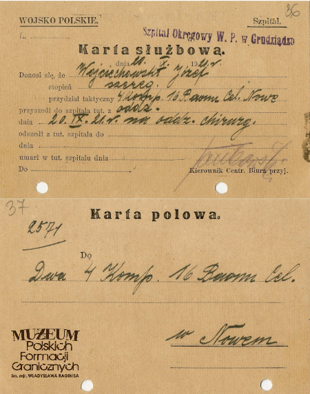 2. Treść: dokument z informacją dotyczącą przyjęcia szer. Józefa Wojciechowskiego, z 4 Kompani 16 Batalionu Celnego do Szpitala Okręgowego W.P. w Grudziądzu na oddział chirurgiczny