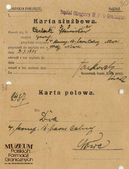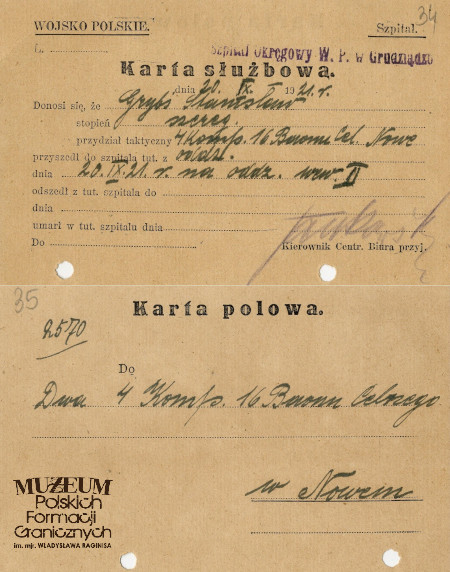 2. Treść: dokument z informacją dotyczącą przyjęcia szer. Stanisława Grybsia z 4 Kompani 16 Batalionu Celnego do Szpitala Okręgowego W.P. w Grudziądzu na oddział wewnętrzny