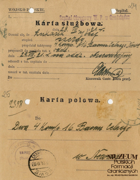 2. Treść: dokument z informacją dotyczącą przyjęcia szer. Józefa Łukasika, z 4 Kompani 16 Batalionu Celnego do Szpitala Okręgowego W.P. w Grudziądzu na oddział obserwacyjny