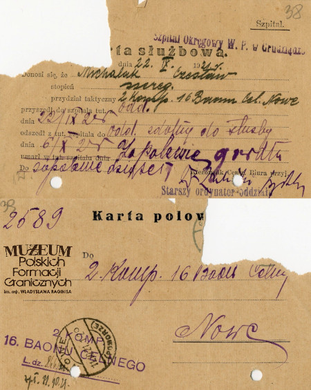 2. Treść: dokument z informacją dotyczącą przyjęcia szer. Czesława Michalaka, z 4 Kompani 16 Batalionu Celnego do Szpitala Okręgowego W.P. w Grudziądzu